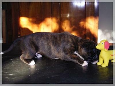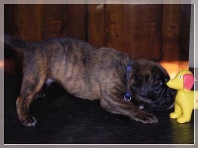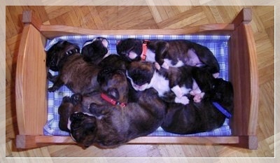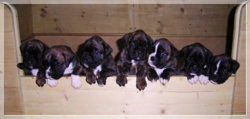 Es tummeln sich 6 Rüden und 1 Hündin in ihrer Wurfkiste. Alle Welpen sind gestromt, mit und ohne Weißzeichnung.